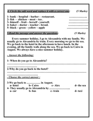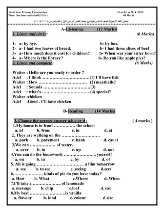 This document provides details about a primary examination for 6th year students, including the date, time allotted, and breakdown of sections. It describes the listening, reading, and writing portions of the exam. The listening section includes exercises to circle answers and complete sentences based on short dialogs. The reading section includes choosing the correct answer, identifying the odd word out, and answering questions about a short passage. The writing section involves writing a 4-sentence letter and rearranging and punctuating sentences. The exam covers a range of English skills and is designed to test 6th year primary students.