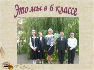 Документ представляет собой визитную карточку учащихся 6 класса. Указаны имена и фамилии учеников, а также их предпочтения в отношении работы и отдыха. Основной акцент сделан на индивидуальные качества и увлечения каждого ученика.