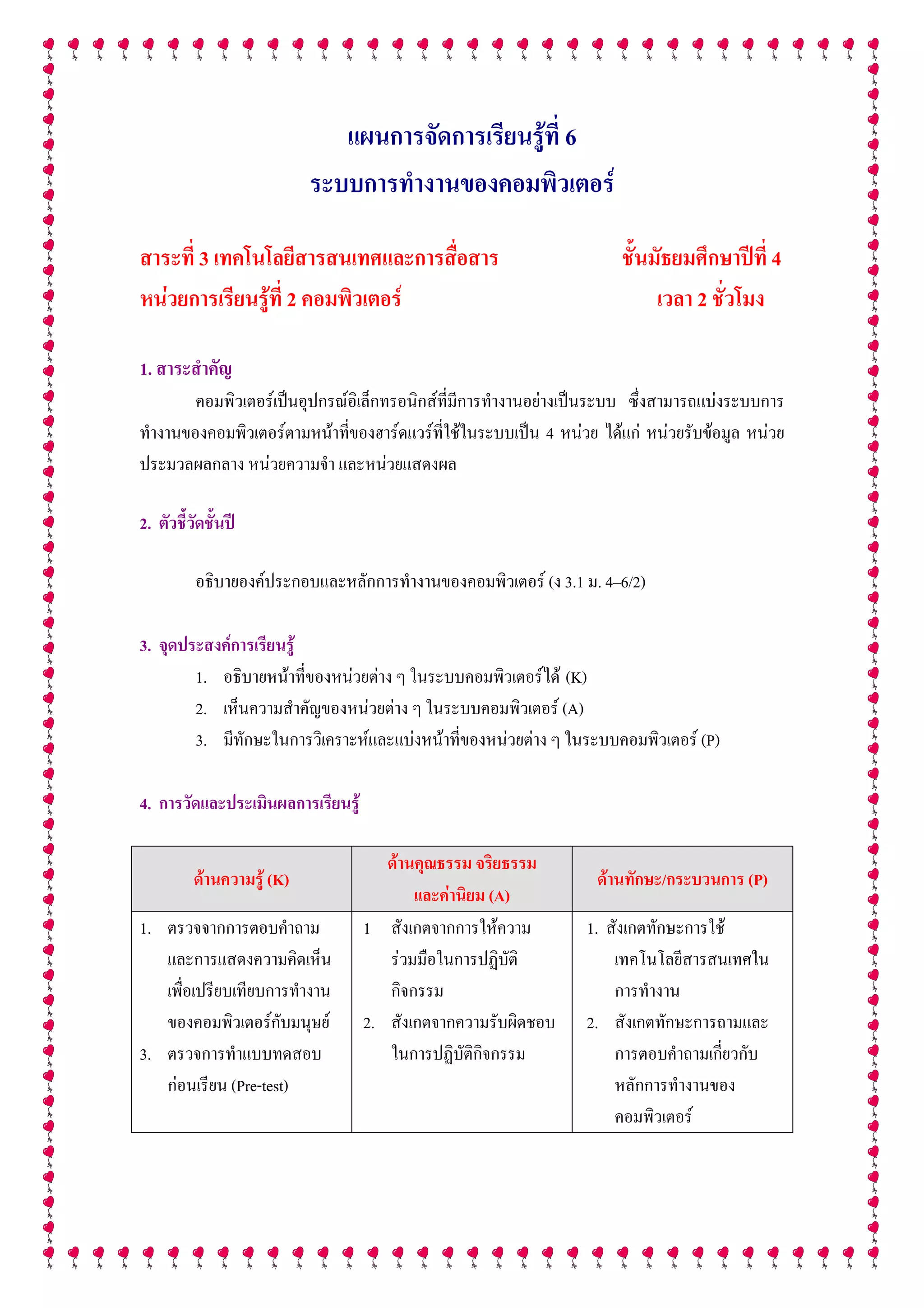 ระบบการทํางานของคอมพิวเตอร สาระที่ 3 เทคโนโลยีสารสนเทศและการสื่อสาร ชั้นมัธยมศึกษาปที่ 4 หนวยการเรียนรูที่ 2 คอมพิวเตอร เวลา 2 ชั่วโมง 1. สาระสําคัญ คอมพิวเตอรเปนอุปกรณอิเล็กทรอนิกสที่มีการทํางานอยางเปนระบบ ซึ่งสามารถแบงระบบการ ทํางานของคอมพิวเตอรตามหนาที่ของฮารดแวรที่ใชในระบบเปน 4 หนวย ไดแก หนวยรับขอมูล หนวย ประมวลผลกลาง หนวยความจํา และหนวยแสดงผล 2. ตัวชี้วัดชั้นป อธิบายองคประกอบและหลักการทํางานของคอมพิวเตอร (ง 3.1 ม. 4–6/2) 3. จุดประสงคการเรียนรู 1. อธิบายหนาที่ของหนวยตาง ๆ ในระบบคอมพิวเตอรได (K) 2. เห็นความสําคัญของหนวยตาง ๆ ในระบบคอมพิวเตอร (A) 3. มีทักษะในการวิเคราะหและแบงหนาที่ของหนวยตาง ๆ ในระบบคอมพิวเตอร (P) 4. การวัดและประเมินผลการเรียนรู ดานคุณธรรม จริยธรรม ดานความรู (K) ดานทักษะ/กระบวนการ (P) และคานิยม (A) 1. ตรวจจากการตอบคําถาม 1 สังเกตจากการใหความ 1. สังเกตทักษะการใช และการแสดงความคิดเห็น รวมมือในการปฏิบัติ เทคโนโลยีสารสนเทศใน เพื่อเปรียบเทียบการทํางาน กิจกรรม การทํางาน ของคอมพิวเตอรกับมนุษย 2. สังเกตจากความรับผิดชอบ 2. สังเกตทักษะการถามและ 3. ตรวจการทําแบบทดสอบ ในการปฏิบัติกิจกรรม การตอบคําถามเกี่ยวกับ กอนเรียน (Pre-test) หลักการทํางานของ คอมพิวเตอร