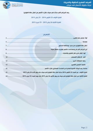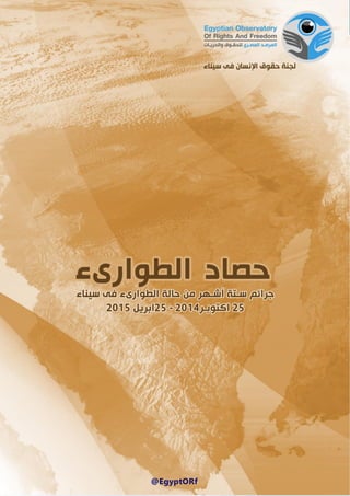 التقرير يرصد الانتهاكات والجرائم التي شهدتها شمال سيناء خلال 6 أشهر من إعلان حالة الطوارئ، حيث تم توثيق 680 حالة قتل خارج إطار القانون و2800 حالة اعتقال تعسفي. كما يشير إلى التهجير القسري لـ8126 أسرة إضافةً إلى تدمير المنازل والممتلكات. يختتم التقرير بالإشارة إلى أن هذه الانتهاكات تشكل جرائم حرب ويعبر عن مخالفة الحكومة للقانون والدستور.