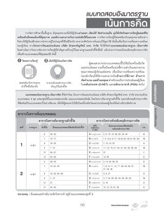 ขอของแบบทดสอบที่สัมพันธกับตัวชี้วัด ระดับ พฤติกรรม การคิด ขอของแบบทดสอบที่สัมพันธกับ ระดับพฤติกรรมการคิด รวม 1 ง 3.1 6 28-33 A ความรู ความจํา 2, 6, 15-16, 28, 33-34, 40 8 7 15-17 B ความเขาใจ 1,3-5,8-9,17-18,20,23-25,31,35-36 15 8 18-25 C การนําไปใช 7, 10, 14, 32 4 9 1-14 D การวิเคราะห 11-12, 19, 21-22, 27, 29-30, 38-39 10 12 26-27 E การสังเคราะห 37 1 13 34-40 F การประเมินคา 13, 26 2 2 ง 3.1 6 28-33 A ความรู ความจํา 2, 14, 22, 28, 33 5 7 14, 23-24 B ความเขาใจ 1, 8-9, 11-12, 17-20, 23, 25, 27, 31-32, 36 15 8 15-22, 25-26 C การนําไปใช 4, 6, 37 3 9 1-13 D การวิเคราะห 3, 7, 24, 29-30, 34-35, 38-40 10 12 27 E การสังเคราะห 5, 16 2 13 34-40 F การประเมินคา 10, 13, 15, 21, 26 5 หมายเหตุ : มีเฉลยและคําอธิบายเชิงวิเคราะห อยูทายแบบทดสอบชุดที่ 3 แบบทดสอบอิงมาตรฐาน เนนการคิด การจัดการศึกษาขั้นพื้นฐาน มีจุดมุงหมายเพื่อใหผูเรียนอานออก เขียนได คิดคํานวณเปน มุงใหเกิดทักษะการเรียนรูตลอดชีวิต เตรียมตัวเปนพลเมืองที่มีคุณภาพ และมีความสามารถในการแขงขันไดในอนาคต การจัดการเรียนรูที่สอดคลองกับจุดมุงหมายดังกลาว จึงควรใหผูเรียนฝกฝนการนําความรูไปประยุกตใชในชีวิตจริง สามารถคิดวิเคราะหและแกปญหาได ดังนั้นเพื่อเปนการเตรียมความพรอม ของผูเรียน ทางโครงการวัดและประเมินผล บริษัท อักษรเจริญทัศน อจท. จํากัด จึงไดจัดทําแบบทดสอบอิงมาตรฐาน เนนการคิด โดยดําเนินการวิเคราะหสาระการเรียนรูที่สําคัญตามที่ระบุไวในมาตรฐานและตัวชี้วัดชั้นป แลวนํามากําหนดเปนระดับพฤติกรรมการคิด เพื่อสรางแบบทดสอบที่มีคุณสมบัติ ดังน�้ แบบทดสอบอิงมาตรฐาน เนนการคิด ที่จัดทําโดย โครงการวัดและประเมินผล บริษัท อักษรเจริญทัศน อจท. จํากัด ประกอบดวย แบบทดสอบ 3 ชุด แตละชุดมีทั้งแบบทดสอบปรนัย และแบบทดสอบอัตนัย โดยวิเคราะหมาตรฐานตัวชี้วัด และระดับพฤติกรรมการคิด ที่สัมพันธกับแบบทดสอบไวอยางชัดเจน เพื่อใหผูสอนนําไปใชเปนเครื่องมือวัดและประเมินผลผูเรียนไดอยางมีประสิทธิภาพ สอดคลองกับมาตรฐาน ตัวชี้วัดชั้นปทุกขอ ตามระดับพฤติกรรมการคิด ที่ระบุไวในตัวชี้วัด วัดผลการเรียนรู เนนใหผูเรียนเกิดการคิด1 2 ผูสอนสามารถนําแบบทดสอบน�้ไปใชเปนเครื่องมือวัด และประเมินผล รวมทั้งเปนเครื่องบงชี้ความสําเร็จและรายงาน คุณภาพของผูเรียนแตละคน เพื่อเปนการเตรียมความพรอม ของนักเรียนใหมีความสามารถในดานการใชภาษา ดานการ คิดคํานวณ และดานเหตุผล สําหรับรองรับการประเมินผลผูเรียน ในระดับประเทศ (O-NET) และระดับนานาชาติ (PISA) ตอไป (1)
