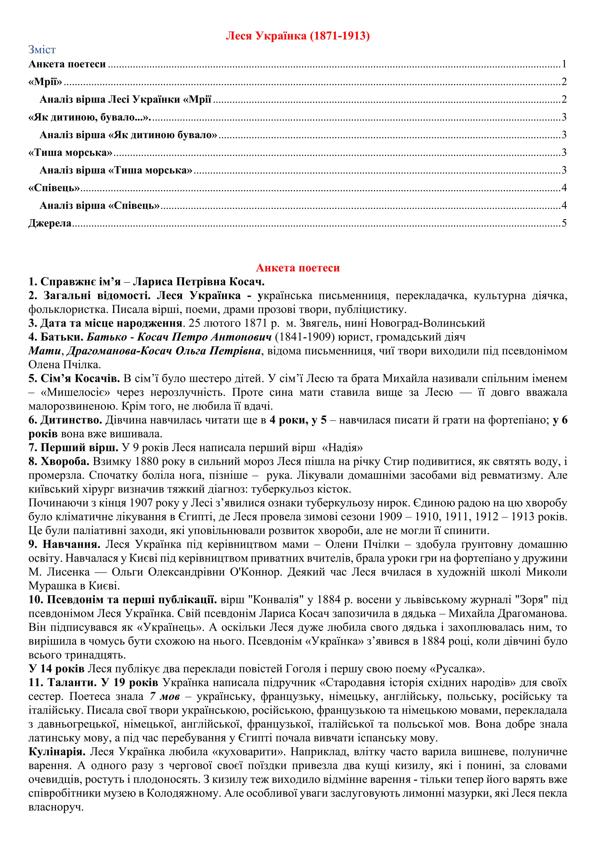 Леся Українка. Аналіз поезій (6 клас). Допомога учню