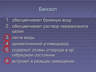 Документ описывает реакционные свойства различных углеводородов, таких как бутадиен, этилен и ацетилен. Указаны их взаимодействия с водородом, бромом и другими веществами, а также их полимеризационные свойства и гибридизации атомов углерода. Подчеркивается, что некоторые соединения обесцвечивают бромную воду и перманганат калия, а также могут использоваться в различных химических реакциях.