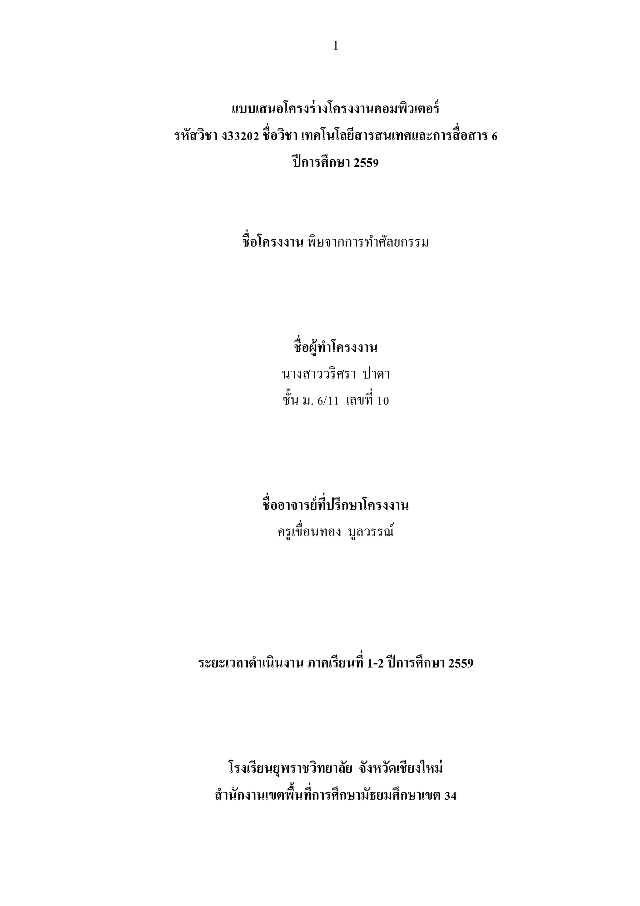เทคโนโลยีสารสนเทศและการสื่อสาร 6 ปีการศึกษา 2559 ชื่อโครงงาน พิษจากการทาศัลยกรรม ชื่อผู้ทาโครงงาน นางสาววริศรา ปาดา ชั้น ม. 6/11 เลขที่ 10 ชื่ออาจารย์ที่ปรึกษาโครงงาน ครูเขื่อนทอง มูลวรรณ์ ระยะเวลาดาเนินงาน ภาคเรียนที่ 1-2 ปีการศึกษา 2559 โรงเรียนยุพราชวิทยาลัย จังหวัดเชียงใหม่ สานักงานเขตพื้นที่การศึกษามัธยมศึกษาเขต 34