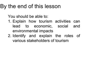 This document discusses the stakeholders and impacts of tourism. It identifies stakeholders as individuals or groups affected by or able to influence tourism objectives. The interactions between tourists, local communities and the environment result in both positive and negative economic, socio-cultural and environmental impacts. While tourism provides economic benefits like revenue, jobs and infrastructure, it can also cause issues like revenue leakage, price inflation and overreliance on tourism. Tourism positively influences culture through preservation but may also dilute or misrepresent local culture. The environment benefits from tourism awareness but suffers from habitat destruction and increased pollution.