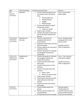 This document provides a lesson plan for a Year 3 English Language class with the theme of "World of Self, Family and Friends" and topic of "Hobbies". The lesson plan aims to help students identify and name activities shown, and to talk, read and write about hobbies. A variety of teaching methods are outlined, including showing gestures of hobbies, reading and discussing a paragraph about hobbies, asking questions about pictures of activities, giving an exercise for students to complete, and doing role-play games by gesture to guess hobbies. The lesson concludes with a content summary and advice about choosing beneficial hobbies.