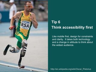 The document outlines practical UX design tips, emphasizing the importance of accessibility and creating content that caters to a diverse audience. It discusses strategies for improving user interaction, such as using clear headings, meaningful alt text for images, and maintaining engagement across multiple devices. The text encourages designers to adopt a mindset that values responsiveness and inclusivity in web design.