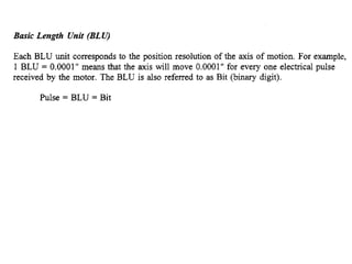 This document discusses the basics of CNC machines including leadscrews, basic length units (BLU), and converting rotational motor motion to linear motion using pitch and teeth per inch. It provides an example of calculating pulse rate and count given a machine's BLU, feed rate, and distance to move. Open and closed loop controls are mentioned along with advantages of CNC like easier programming, storage, changes, avoiding errors, and producing complex geometries as cheaply as simple ones.