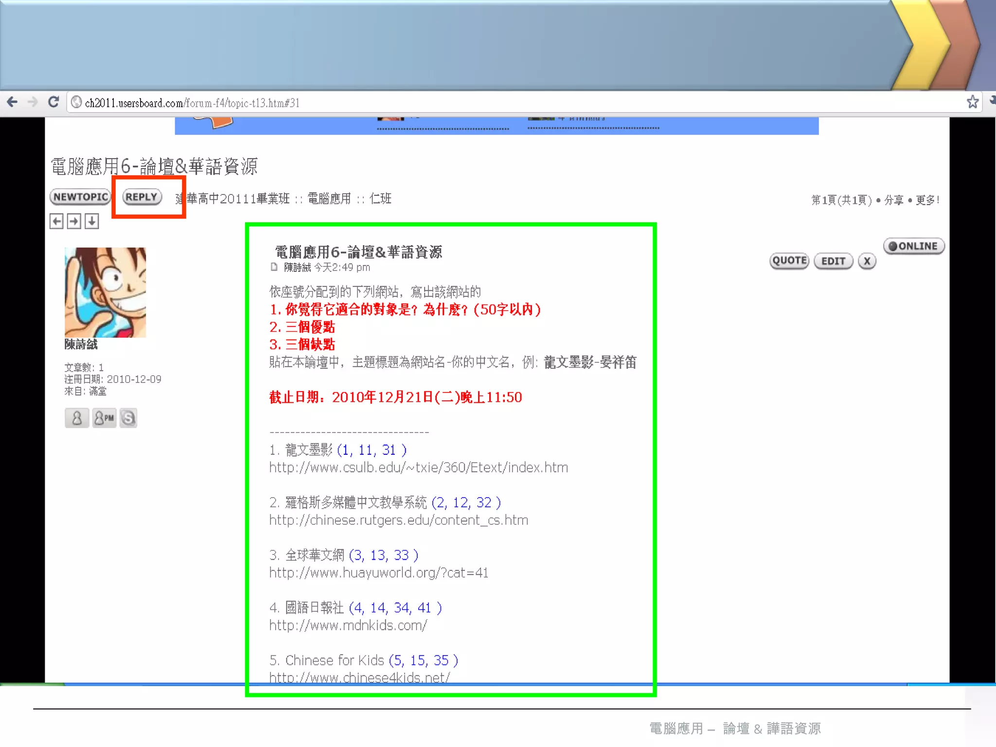 依座號分配到的下列網站,寫出該網站的 你覺得它適合的對象是?為什麼? (50 字以內 ) 3 個優點 3 個缺點 貼在本論壇中,主題標題為 網站名 - 你的中文名 ,例 : 龍文墨影 - 晏祥笛 截止日期: 2010 年 12 月 21 日 ( 二 ) 晚上 11:50