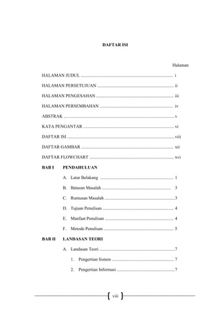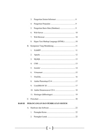 This document provides an overview and table of contents for a thesis on developing an online store website using the Joomla content management system (CMS). The introduction discusses the background, problem statement, objectives, benefits and research methods. The theoretical foundation chapter covers concepts of systems, information, databases, web servers, HTML and components used - XAMPP, Apache, MySQL, Joomla, Virtuemart and tools like Photoshop and Dreamweaver. It includes a system flowchart. The design and development chapter describes the hardware, software and steps to install XAMPP, database, Joomla locally and then deploy the site to a web host, and install Virtuemart. The testing and results chapter includes flowcharts