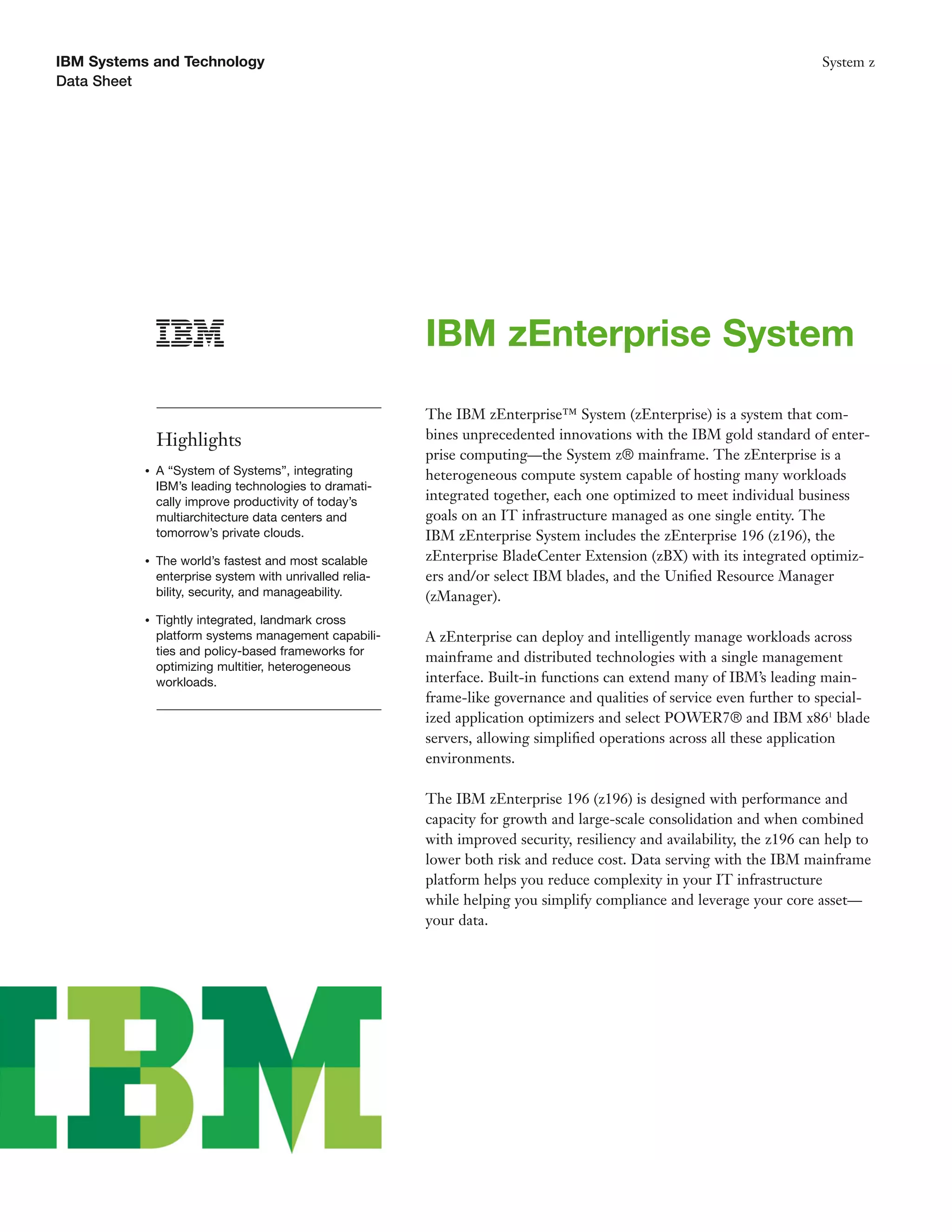 The IBM zEnterprise system integrates multiple computing architectures within a single management framework, offering enhanced productivity, scalability, and security for enterprise data centers. It features advanced resource management through the unified resource manager, allowing for streamlined operations across heterogeneous workloads and the ability to utilize IBM's latest technologies. The system is designed to support dynamic application deployment, improve cost efficiency, and enhance infrastructure management while minimizing complexity.