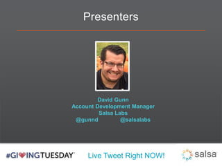 The document discusses strategies for successfully participating in #GivingTuesday through insights from a study of approximately 500 nonprofit organizations and emphasizes the importance of audience engagement and effective communication. Key fundraising rules for Twitter include demonstrating ROI, setting achievable goals, harnessing the power of social networks, and ensuring cohesive branding. It also highlights the significance of email segmentation and personalization as effective fundraising methods leading up to the event.