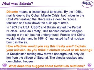 Détente was a period in the 1960s-1970s marked by efforts to reduce tensions between the US and USSR through arms control agreements like SALT I and cooperation in space. However, arms continued to increase on both sides after SALT I. Cooperation grew in areas like Antarctica research and space stations, but arms talks proved limited in curbing weapons buildups. Overall, détente had mixed success in improving relations versus controlling arms.