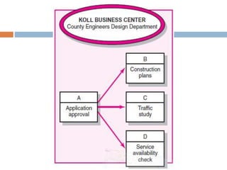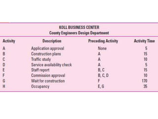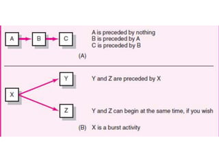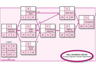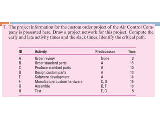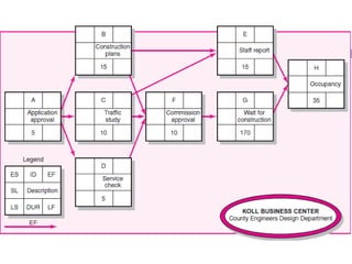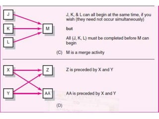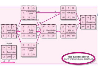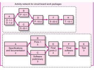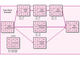 This document discusses developing a project network plan. It explains that a project network shows project activities and their logical sequence and interdependencies. It is used for planning, scheduling, and monitoring project progress. The document outlines how to construct a project network by first identifying work packages from the work breakdown structure and then defining those work packages as activities with dependencies. It describes key network terminology like activities, paths, and critical path. It also explains how to perform forward and backward passes to calculate earliest and latest start/finish times and determine which activities have slack or are on the critical path.