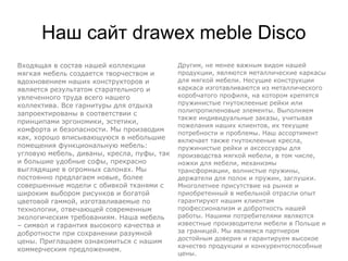 Компания 'Польша-Диско Колл-Он' была основана в 1993 году и специализируется на производстве металлических каркасов для мебели и мягкой мебели, предлагая широкий ассортимент изделий, включая функциональные угловые диваны и кресла. Продукция компании отличается высоким качеством, экологичностью и широким выбором цветовых решений, что позволяет удовлетворять индивидуальные потребности клиентов. Она также предоставляет услуги по выполнению индивидуальных заказов и имеет надежную репутацию как среди польских, так и зарубежных производителей мебели.