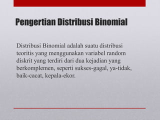 Dokumen ini membahas distribusi binomial dan poisson, menjelaskan pengertian, ciri-ciri, dan rumus masing-masing distribusi. Distribusi binomial berfokus pada dua hasil yang berkomplemen dengan contoh perhitungan probabilitas dari produksi televisi rusak, sedangkan distribusi poisson digunakan untuk kejadian langka dalam periode pendek dengan contoh probabilitas anak balita yang menderita gizi kurang. Kedua distribusi ini memiliki aplikasi penting dalam probabilitas dan analisis statistik.