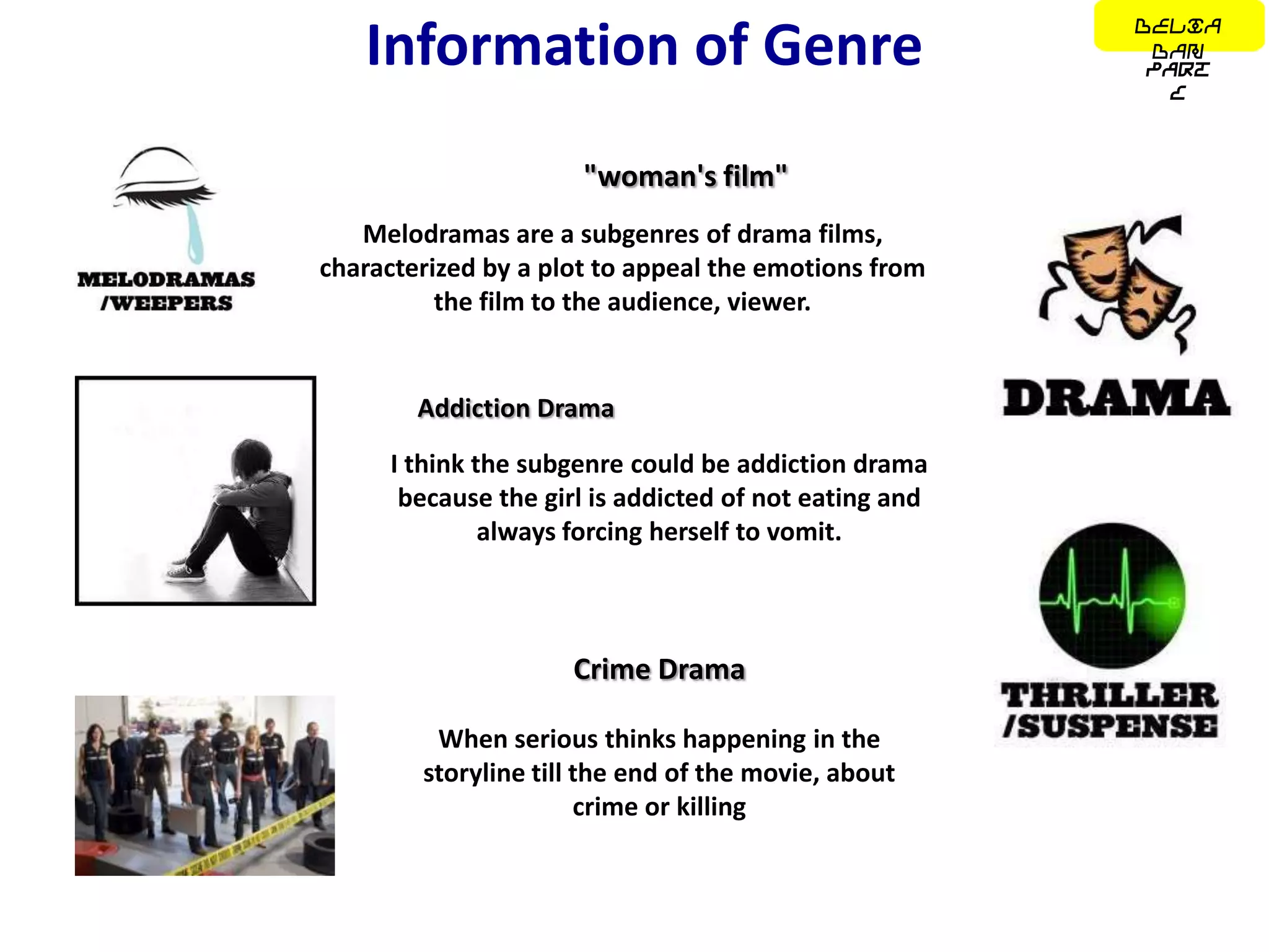 This document discusses conventions of genre drama and sub-genre thriller films. It provides examples of different films that demonstrate conventions like love, sadness, social class, tragedy, poverty, isolation, mirrors, shadows, flashbacks, death/killing, and blood. Still shots from each example film are described as showing the convention through things like characters' emotions, situations, costumes, and implications of danger or past events. The document analyzes how visual elements in the still shots convey the genre conventions.