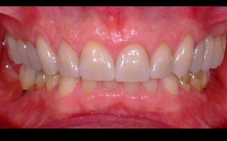 This document summarizes the treatment plan for a 61-year-old male patient seeking improvement of the esthetics of his upper front teeth. The patient has a history of thrombosis and is on anticoagulant medication. An examination found excessive gum display when smiling, short upper front teeth, and wear from parafunction. The treatment plan involves creating provisional restorations to test aesthetics, function, and phonetics. Definitive ceramic restorations will then be made by copying the approved provisionals. A night guard will also be provided and follow-ups scheduled to ensure long-term success of the treatment.