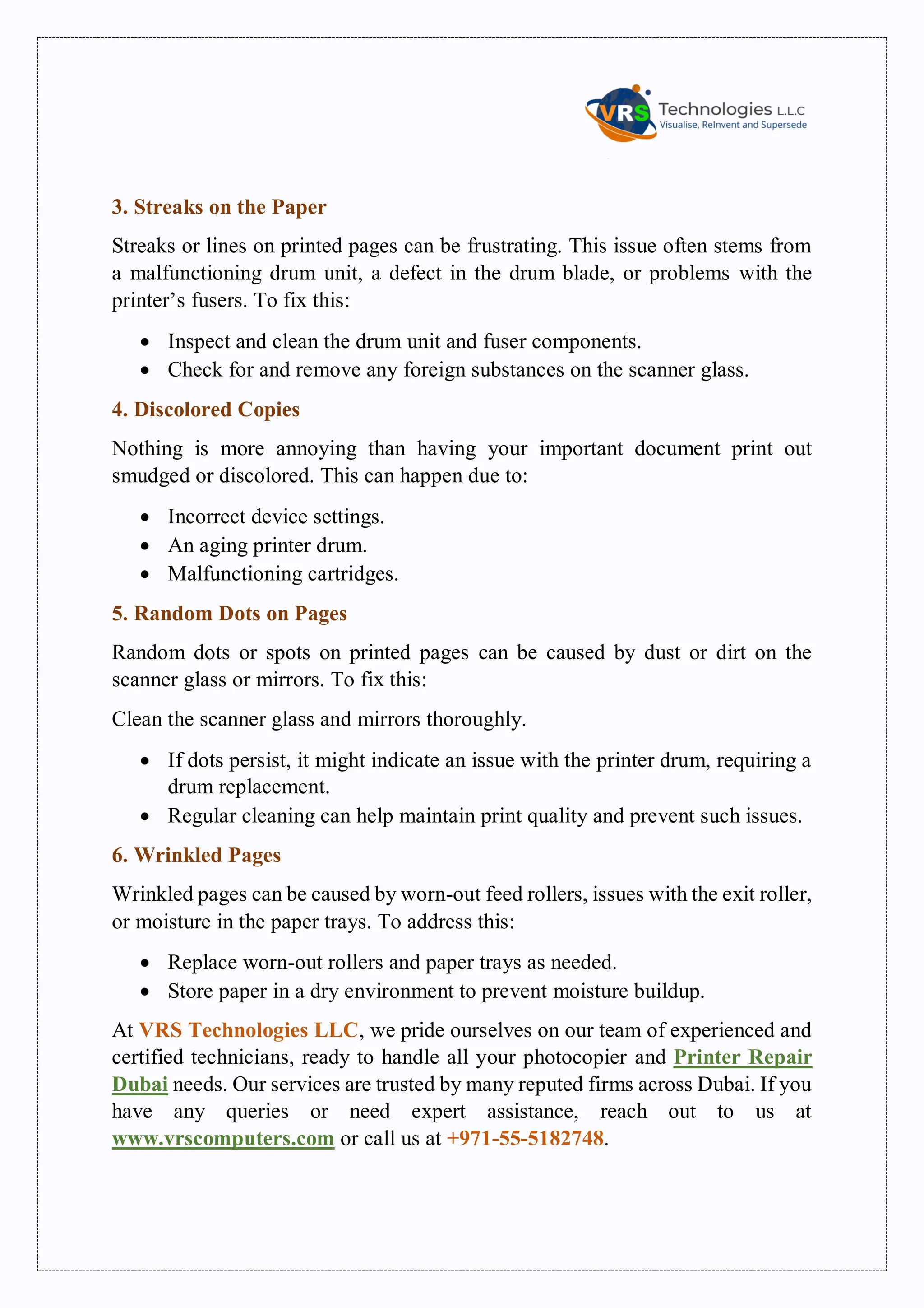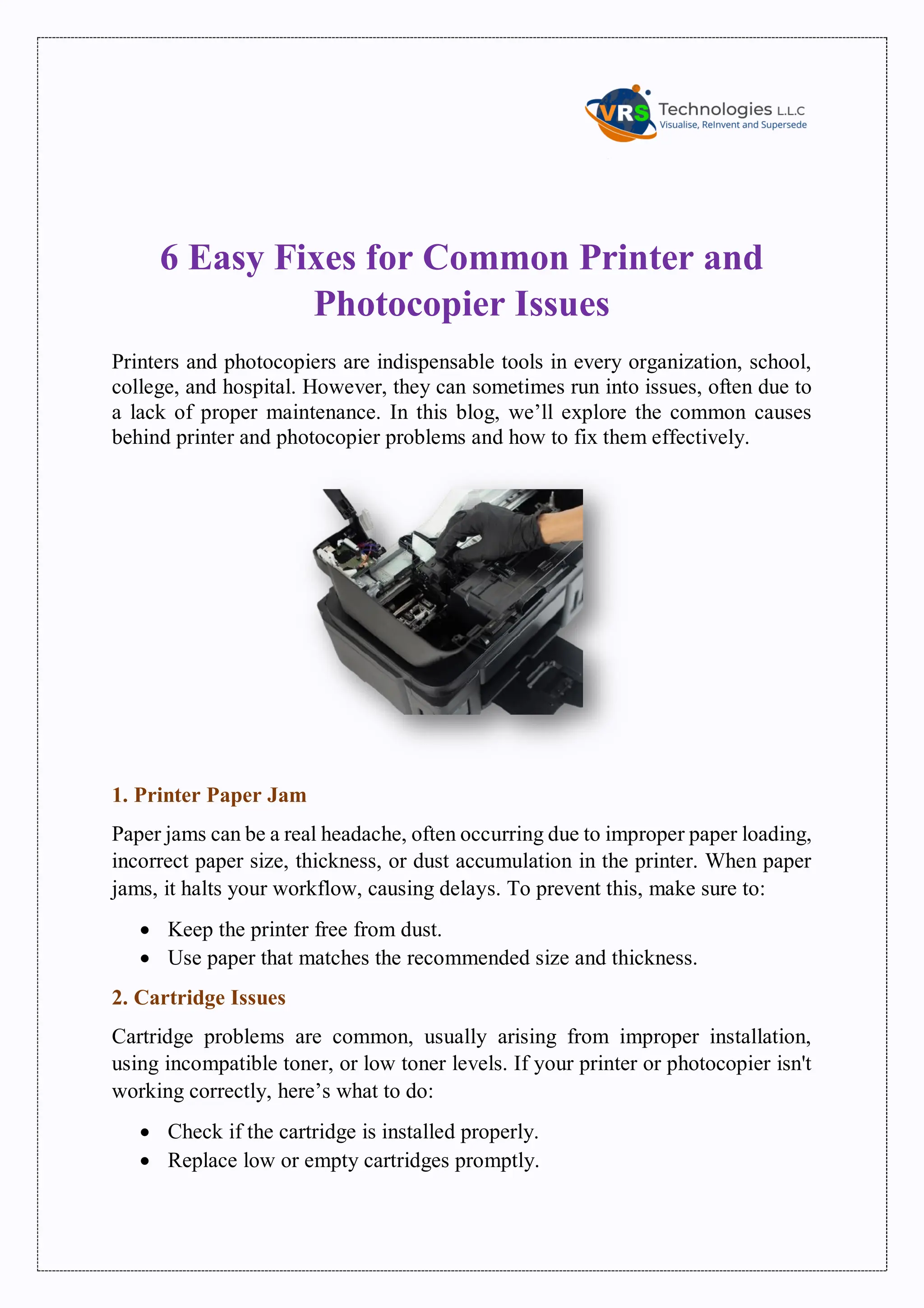Here we explain 6 Easy Fixes for Common Printer and Photocopier Issues by VRS Technologies LLC's PDF. Discover simple solutions to common printer problems. Need expert assistance? Contact us at +971-55-5182748 for reliable Printer Repair in Dubai.