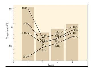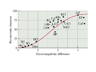 This document discusses electronegativity and electron affinity. It explains that electronegativity is an atom's ability to attract electrons in a covalent bond, and fluorine is the most electronegative while cesium is the least. Electron affinity is the energy change when an electron is added to a gaseous atom or ion. The difference in electronegativity between elements in an ionic compound determines its ionic character. Compounds with a difference greater than 1.7 are considered ionic. Electronegativity also influences molecular properties like polarity and boiling points through hydrogen bonding abilities.
