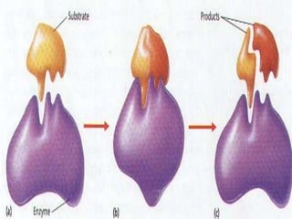 Enzymes are proteins that act as catalysts to speed up chemical reactions by lowering their activation energy. They work through a lock-and-key mechanism where the enzyme and substrate physically fit together. This binding allows the enzyme to facilitate the reaction. Enzyme function can be inhibited through competitive inhibitors, which bind to the active site, or noncompetitive inhibitors, which induce a conformational change in the enzyme preventing substrate binding. Environmental factors like temperature, pH, and salt concentration can also impact an enzyme's activity by causing it to denature.