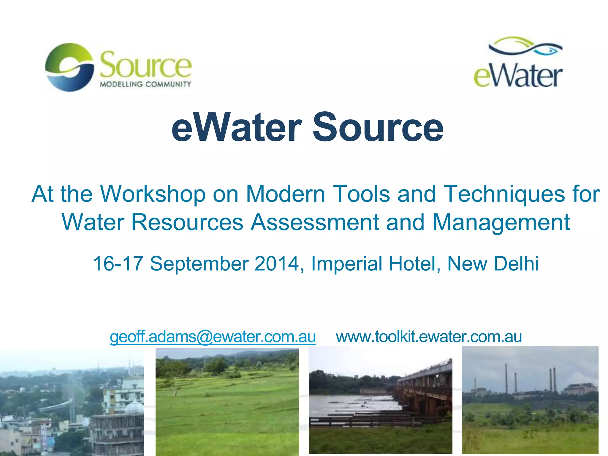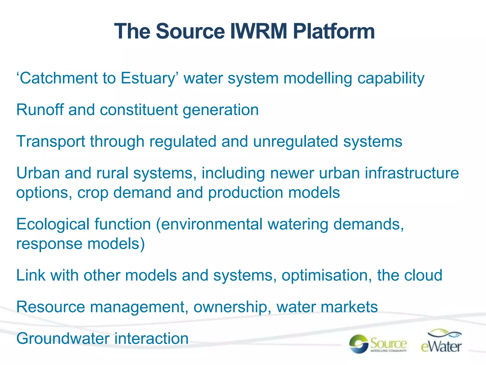 This document describes eWater Source, a hydrological modeling platform for integrated water resource management. It can model runoff, constituent transport, urban and rural water systems, as well as ecological processes. Models are used to develop and monitor water policy. The platform is flexible and customizable through plugins. It has been used extensively in Australia for statutory water resource management.