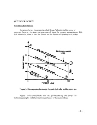 2. Governors have a droop characteristic to automatically adjust the generator's output based on frequency changes. The AVR keeps terminal voltage constant despite load variations.