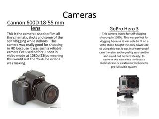 The document provides details about the filmmaker's production process for creating a YouTube video. It describes the cameras used - a Canon DSLR and GoPro - and issues with audio quality from the GoPro. It outlines steps taken which included organizing footage, creating a shot list, editing clips, adding music, and effects. Graphics were included for openings/closings. The final video was exported at 720p for YouTube. A thumbnail was made by cropping a screenshot. Additional content was made to increase popularity and draw viewers to other videos. A logo design was linked to Redbubble for merchandise.