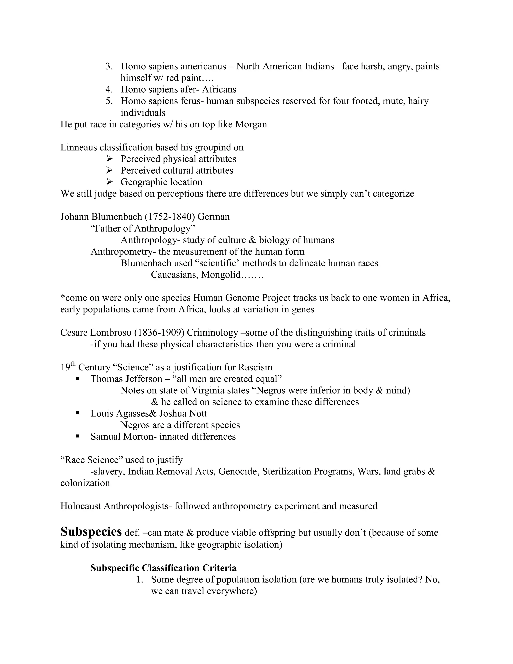 This document discusses race as a biological concept and summarizes the history of how race was categorized scientifically. It notes that while early scientists like Linnaeus and Blumenbach attempted to categorize humans into racial subspecies based on physical attributes and geography, modern genetics shows that all humans are one species with a high degree of variation. The concept of race as a distinct biological category is an outdated social construct not supported by science, as humans cannot be clearly or consistently delineated into subspecies and meet the accepted criteria for subspecies classification.