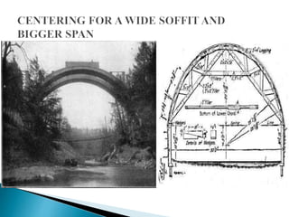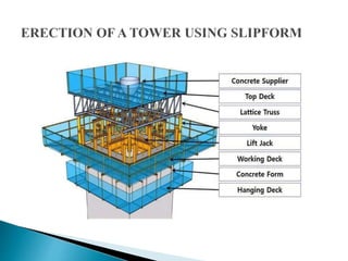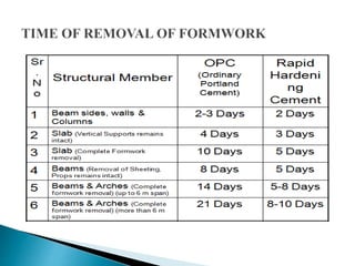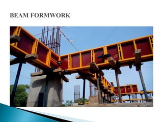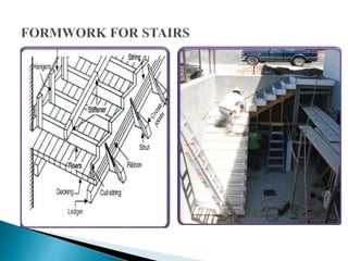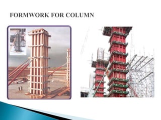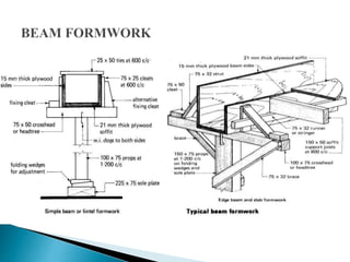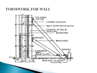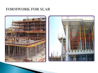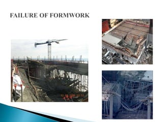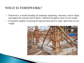 The document discusses the design, construction, and specifications of formwork used in concrete construction, highlighting its various materials like timber, steel, and plastic. It outlines key factors such as strength, rigidity, and economy essential for effective formwork, along with the assembly and stripping processes. Additionally, it addresses common failures and their causes, emphasizing the importance of proper material specifications and inspection prior to concrete placement.