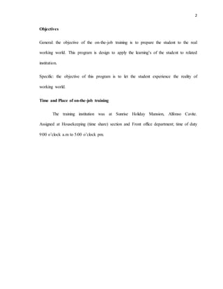 The document summarizes the on-the-job training experience of a hospitality student at Sunrise Holiday Mansion in Alfonso, Cavite. The trainee performed tasks in the front office and housekeeping departments, gaining exposure to guest services and room cleaning. Some challenges encountered included not knowing where to find amenities. The training helped the trainee improve communication skills and handling of guests. It provided real-world experience that prepared the trainee for a career in the hospitality industry.