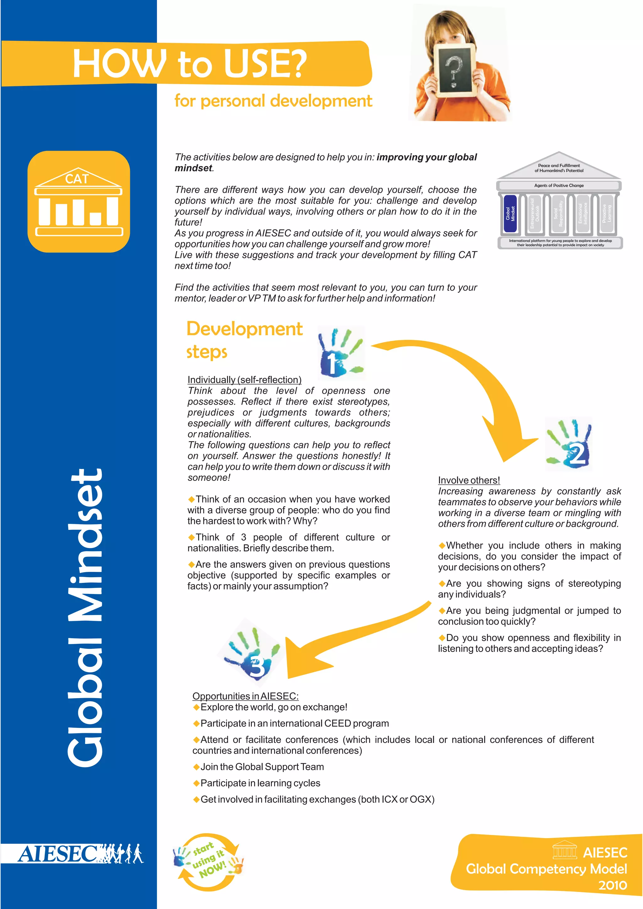 This document provides activities to help with personal development in several areas: global mindset, emotional intelligence, social responsibility, entrepreneurial outlook, and proactive learning. For each area, it lists individually-focused self-reflection questions and suggests involving others through discussions, feedback, and leadership opportunities within AIESEC. The goal is to choose development activities suitable for each person and track progress over time to continuously improve.