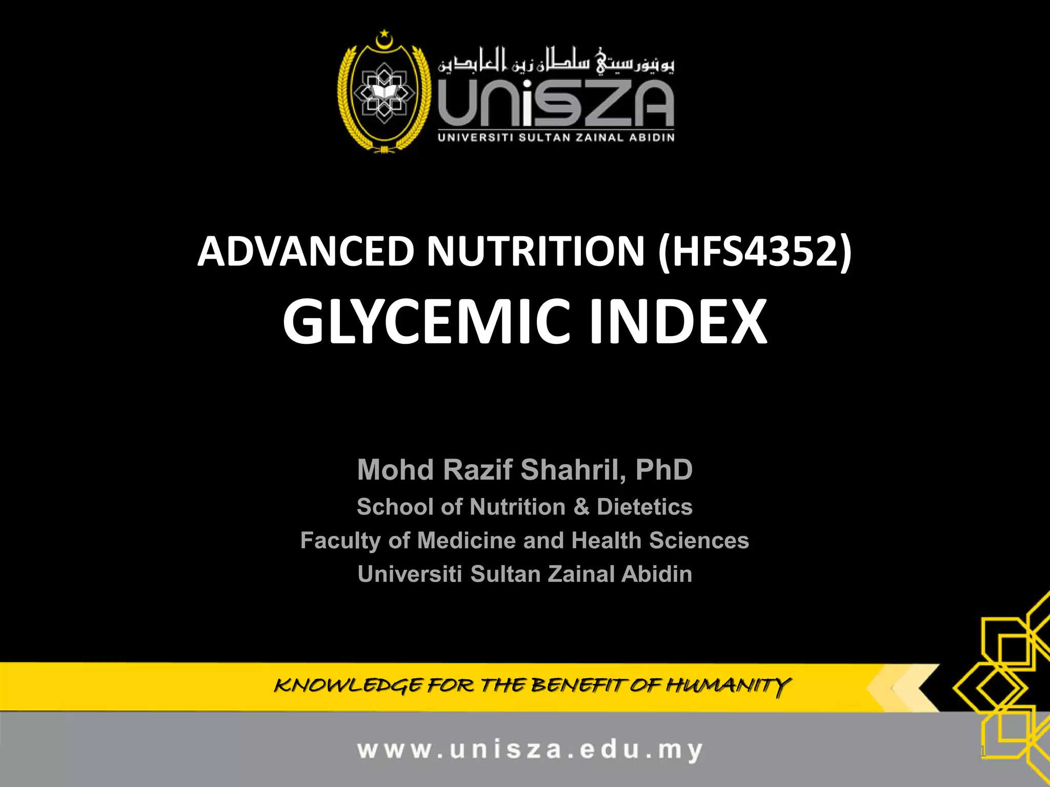 This document discusses glycemic index (GI), a measure of how foods affect blood glucose levels. It provides details on GI determination, factors that influence GI values, benefits of a low GI diet, and recommendations. Specifically, it finds that a low GI diet is associated with lower blood glucose and HbA1c levels, improved lipid profiles, weight control, and decreased risk of heart disease and diabetes. The take home message encourages choosing high-fiber whole grains and fruits/veggies while limiting refined sugars and large portions of high GI foods.
