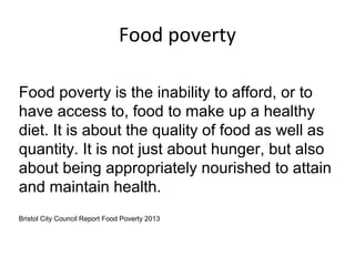 This document discusses the issue of holiday hunger among children in the UK. It defines food poverty as the inability to afford or access nutritious food. During school holidays, many children who rely on free school meals lose this source of food. The document recommends several programs to address holiday hunger, including providing meals and activities during holidays, ensuring families can access benefits, and conducting research on best practices. It concludes that a national campaign and increased funding are needed locally and nationally to identify families in need and deliver good food in a safe environment during school breaks.