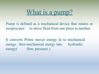 Pumps move fluid from one place to another by converting energy into hydraulic energy and pressure. There are several types of pumps including positive displacement pumps which apply direct pressure on the fluid. Reciprocating positive displacement pumps use pistons, plungers or diaphragms and valves to move fluid in an oscillating motion. Specific examples described include piston pumps such as lift pumps and force pumps, axial piston pumps which have pistons arranged circularly in a housing, and diaphragm pumps which use a reciprocating diaphragm and valves to pump fluid.