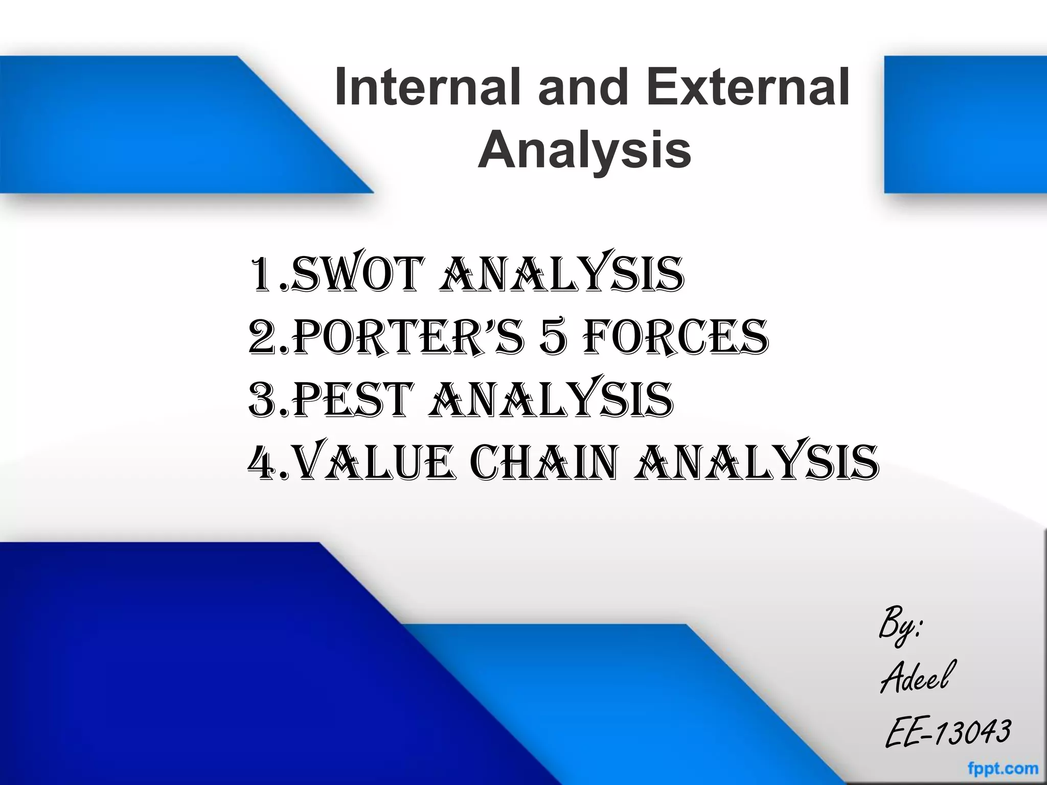The document discusses several strategic analysis tools including SWOT analysis, Porter's Five Forces, PEST analysis, and Value Chain analysis. It details the purpose, advantages, limitations, and methodology of each tool to help organizations understand their internal and external environments, competitive landscape, and operational efficiencies. The insights provided aim to enhance strategic planning and decision-making processes for businesses.