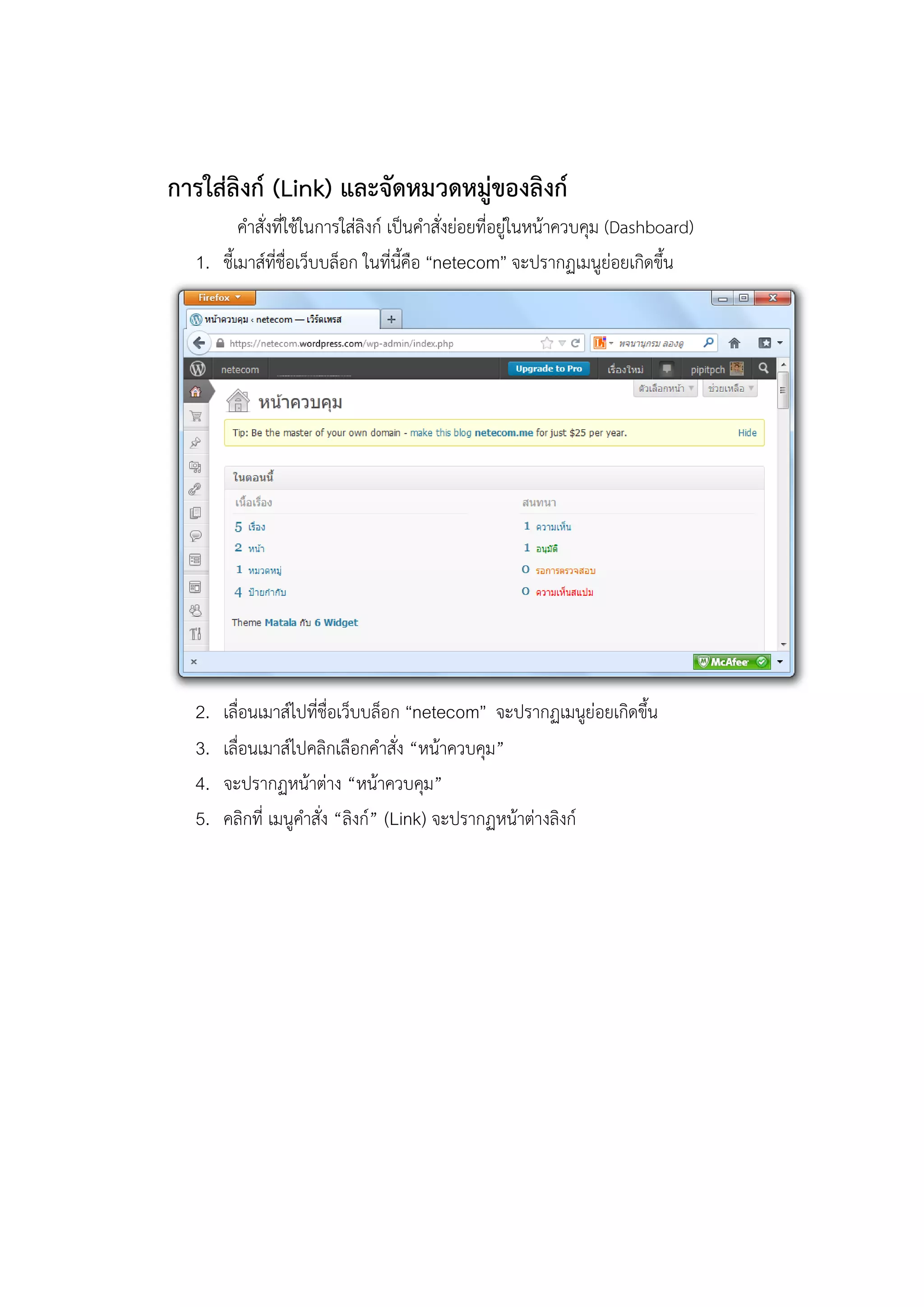 เปนคําสั่งยอยที่อยูในหนาควบคุม (Dashboard) 1. ชี้เมาสที่ชื่อเว็บบล็อก ในที่นี้คือ “netecom” จะปรากฏเมนูยอยเกิดขึ้น 2. 3. 4. 5. เลื่อนเมาสไปที่ชื่อเว็บบล็อก “netecom” จะปรากฏเมนูยอยเกิดขึ้น เลื่อนเมาสไปคลิกเลือกคําสั่ง “หนาควบคุม” จะปรากฏหนาตาง “หนาควบคุม” คลิกที่ เมนูคําสั่ง “ลิงก” (Link) จะปรากฏหนาตางลิงก