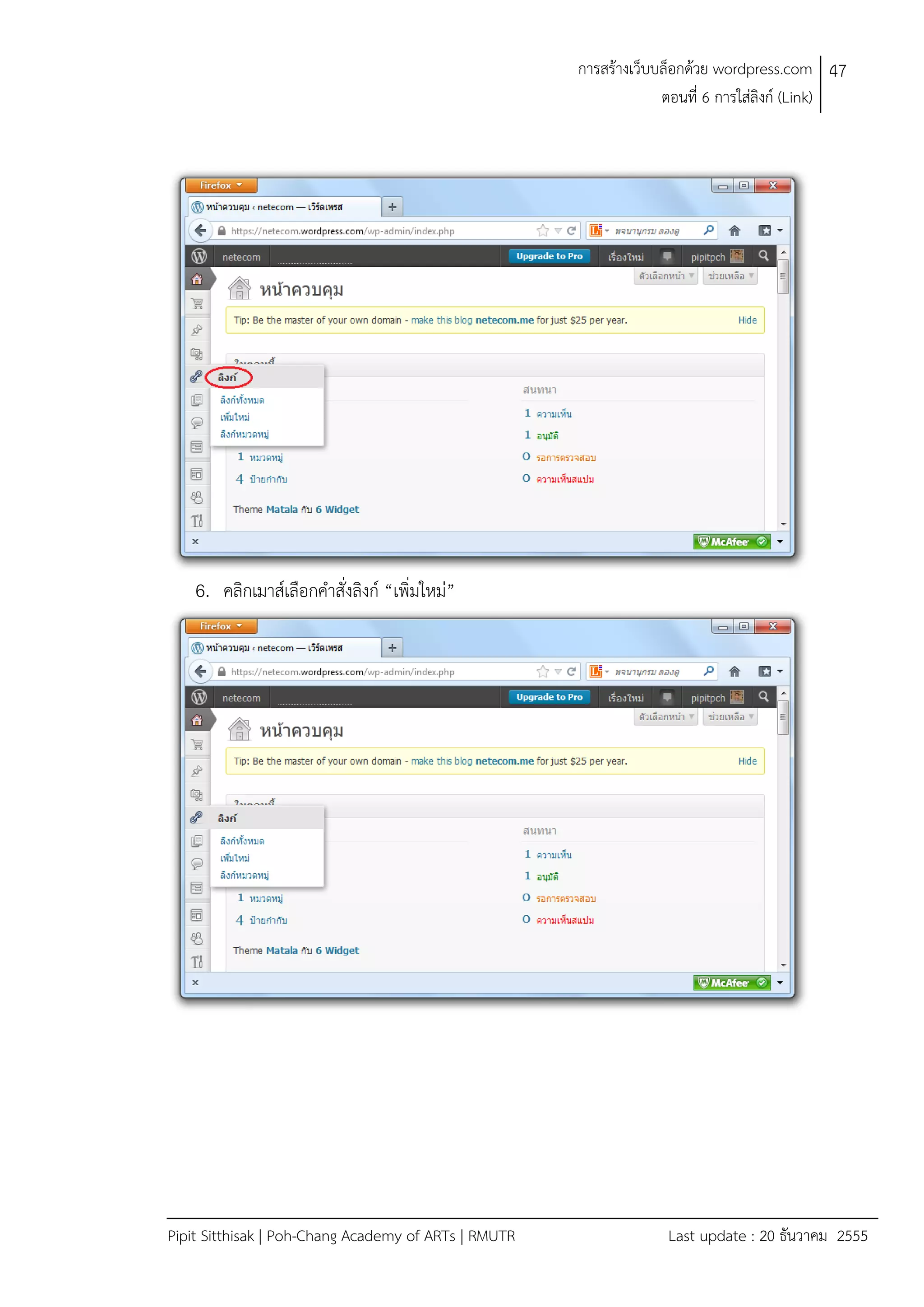 6 การใสลิงก (Link) 6. คลิกเมาสเลือกคําสั่งลิงก “เพิ่มใหม” Pipit Sitthisak | Poh-Chang Academy of ARTs | RMUTR Last update : 20 ธันวาคม 2555