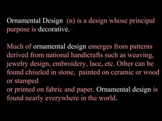 Ornamental design is primarily decorative and emerges from national handicraft patterns like weaving, embroidery, and jewelry design. It is found worldwide in artifacts, architecture, and objects and signifies the cultural identity of a people. Ornamental design has two main components: motifs, which are single decorative elements, and patterns, which are repetitive uses of one or more motifs.