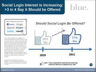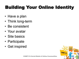 This document discusses building and maintaining an online identity. It recommends having a plan, being consistent, using an avatar, and participating on sites to build an identity over the long term. It warns that online identities can easily be destroyed by boring, disrespectful, or questionable posts. It provides tips for protecting identities such as account password management and login regularly. People manage multiple accounts by using the same username/password across sites or storing login details securely offline or online. Social login options like OpenID and Facebook Connect allow logging into third party sites using an existing account.