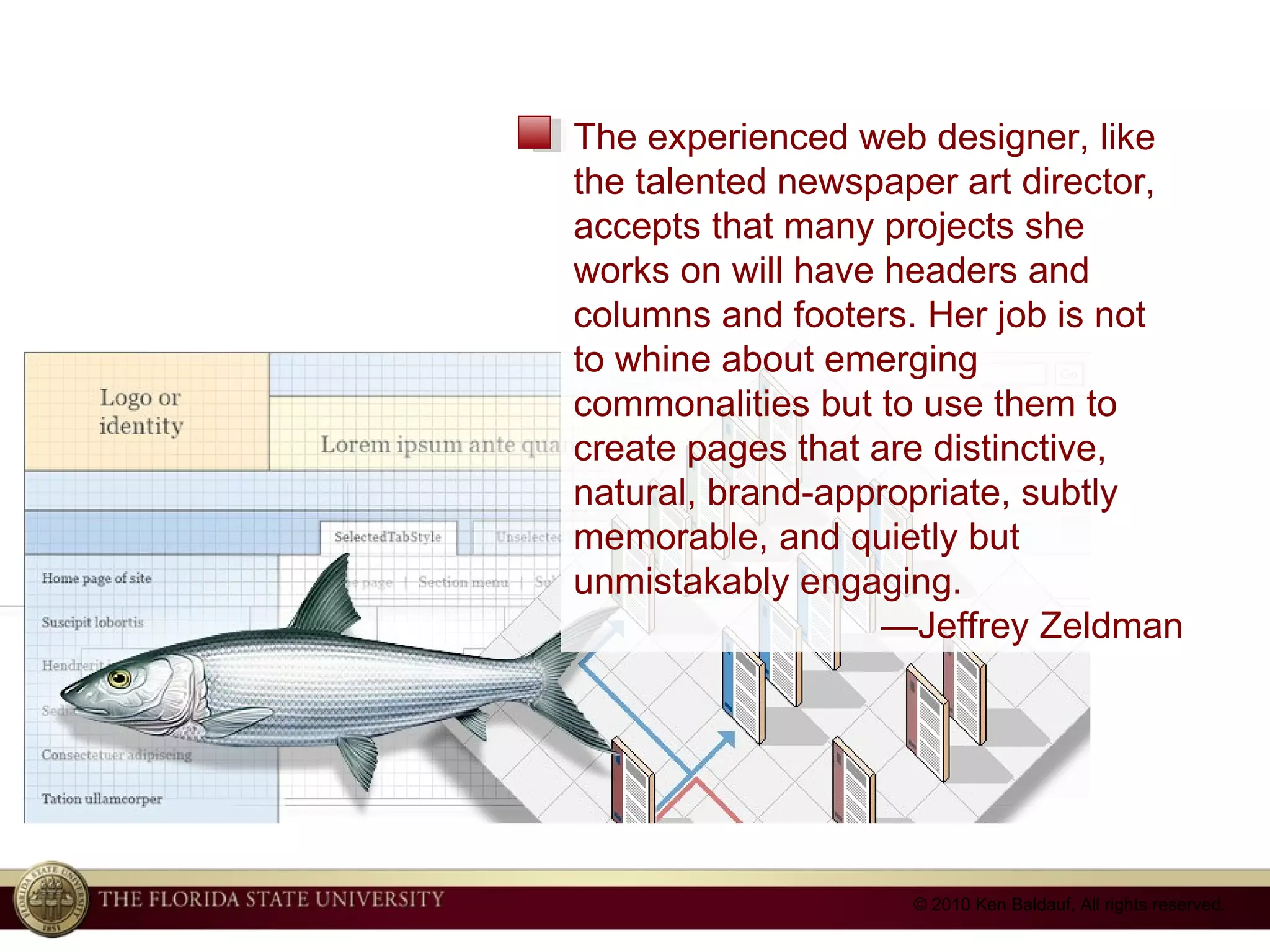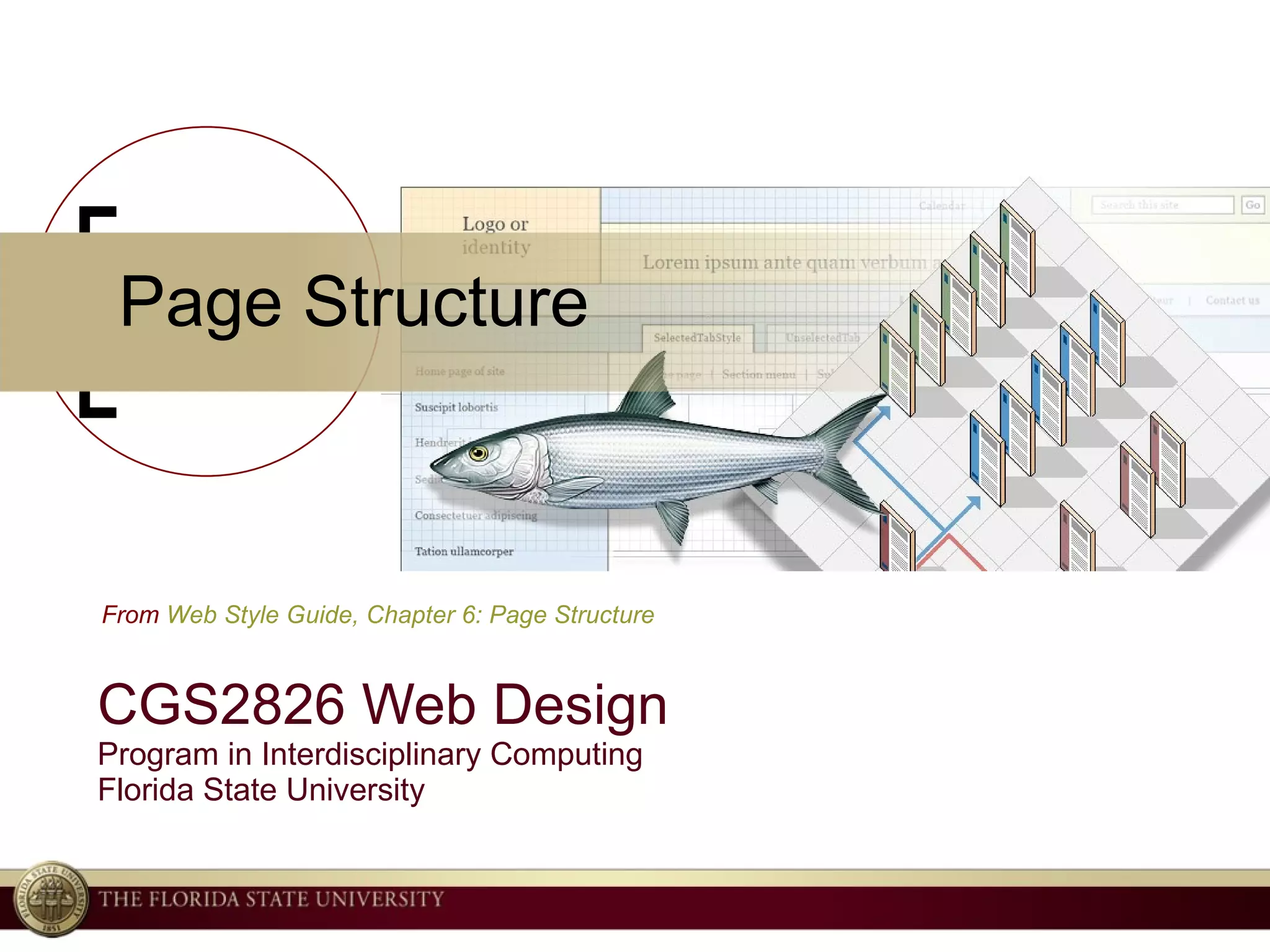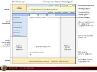 The document discusses best practices for structuring web pages. It recommends that pages include headers, content areas, and footers. Headers should provide site identity and navigation, while footers house minor informational elements. Templates help ensure consistency across pages by establishing common design elements. The document advises against using splash pages that do not provide functional value to users.
