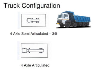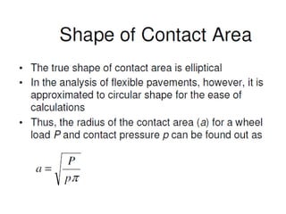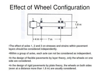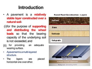 Pavement is a layered structure constructed over soil to support vehicle loads. It has multiple layers - subgrade, sub-base, base, and surface course. Pavements are classified as flexible, rigid, or composite based on material properties. Flexible pavements are made of asphalt and deform under loads, while rigid pavements are made of concrete and resist deformation. Pavement design considers factors like traffic loads, material properties, environment, and failure criteria to determine layer thickness to support loads over the design life.
