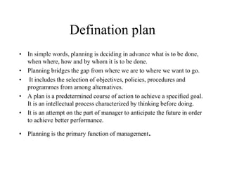 Planning involves deciding in advance what is to be done, when, where, how, and by whom. It bridges the gap from the present to the future. Good planning is an intellectual process, sets objectives, considers alternatives, and helps achieve goals. Strategic planning matches resources and capabilities to market opportunities for long-term growth. It defines an organization's mission and allocates resources among strategic business units. Marketing planning involves analyzing the environment, setting objectives, and developing mix strategies to select target markets.