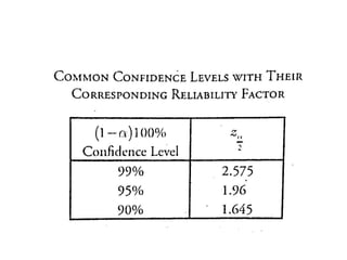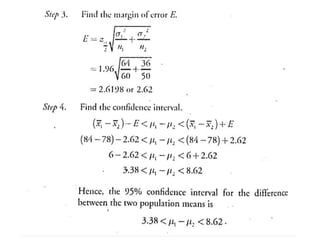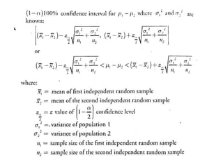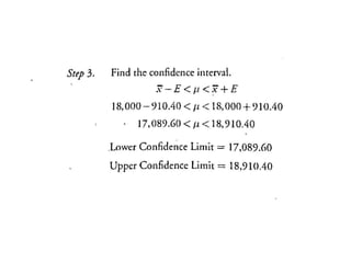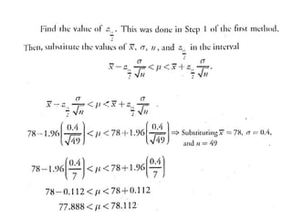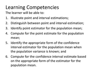 The document outlines the concepts of point and interval estimation in statistics, highlighting how to compute point estimates for population parameters, specifically the population mean. It explains the importance of random sampling and large sample sizes to improve the accuracy of estimations, as well as how to calculate confidence intervals to provide a range within which a population parameter is likely to lie. Several examples illustrate the application of these concepts, including the computation of confidence intervals for known population variances and sample means.