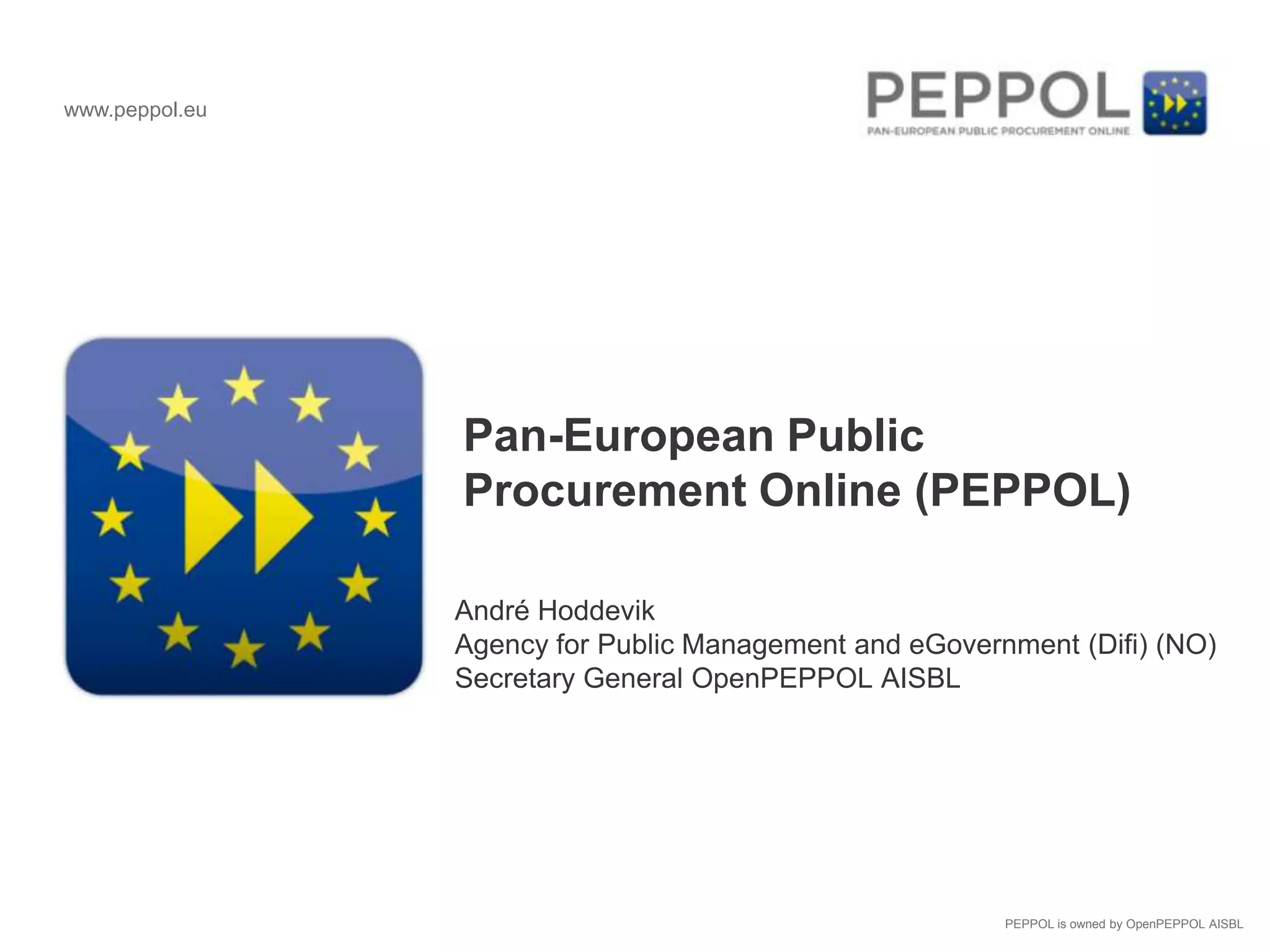 (1) PEPPOL offers solutions for pan-European eProcurement through standardized specifications for electronic catalogues, ordering, and invoicing. (2) The PEPPOL project established these standards and infrastructure, and upon completion, OpenPEPPOL was formed to continue promoting adoption. (3) OpenPEPPOL membership is now open to public and private organizations to further interconnect European procurement processes.