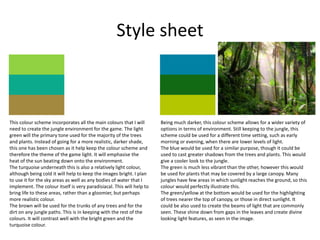 The document discusses a color scheme for a jungle-themed game environment, with light green as the primary color for trees and plants to keep the theme light, and turquoise and brown used for water, sky, and tree trunks/paths. It also considers color schemes from other games like Arma 3 and Just Cause 2 and how varying light levels would impact the colors used. The style of artwork is evaluated from screenshots of other games to achieve a balance of detail and simplicity.