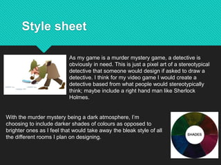 The document discusses plans for a murder mystery video game. It includes summaries of potential characters like a detective, murderer, and suspects. It also describes plans for different rooms that could be included, like rooms where suspects would provide alibis. Examples of styles and colors are provided for the different characters and rooms. Potential sound effects and music are also listed. The document discusses contingency planning and health and safety considerations for the project.