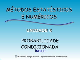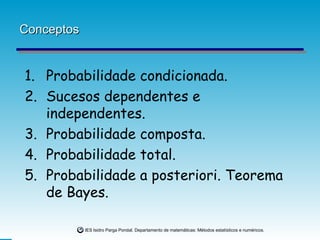 Conceptos Probabilidade condicionada.Sucesos dependentes e independentes. Probabilidade composta. Probabilidade total. Probabilidade a posteriori. Teorema de Bayes.