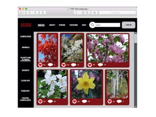 The document describes the process of creating a photography portfolio, website, and magazine. For the portfolio, the creator selected 8 photos to feature and placed them in boxes for structure. A simple black and white color scheme was used. For the website, images were placed in rounded rectangles and navigation bars were added. Features like search, login, and social buttons were included. The magazine's front cover included a featured photo, logo, and banner with content details. Colors like red, yellow and white were used to make the page vibrant but not busy. Care was taken to align elements and choose appropriate fonts and layouts to make the works look professional.