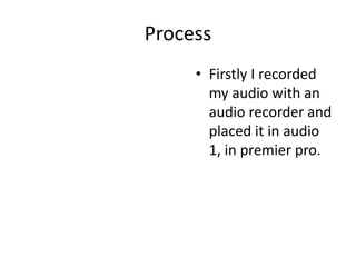 Josh Palmer recorded audio for a production project. He increased the volume of the audio, cut out unwanted sections, added non-copyrighted background music that he trimmed to match the length of the audio, and inserted sound effects in gaps he created, adjusting the volume of everything. He then listened to the final product and exported it.